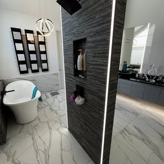 We installed large format tile (24x48) to the floors and walls to avoid as many grout lines as possible.